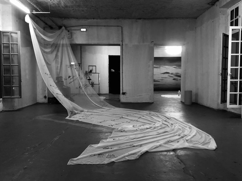 LV: O escrever aparece muitas vezes na tua obra como algo difuso, entre uma promessa de legibilidade e um desvanecimento pela transparência. Como nos teus trabalhos em tecido ou papel seda, que devido às características do próprio material, de transparência ou de criação de dobras, tornam a vontade de ler numa acção impossível. Parece-te que há uma ênfase permanente no escrever como acção total (física, espacial, material), ao lograr as expectativas de um espectador que, perante um texto, espera sempre conseguir apreender uma mensagem escrita?