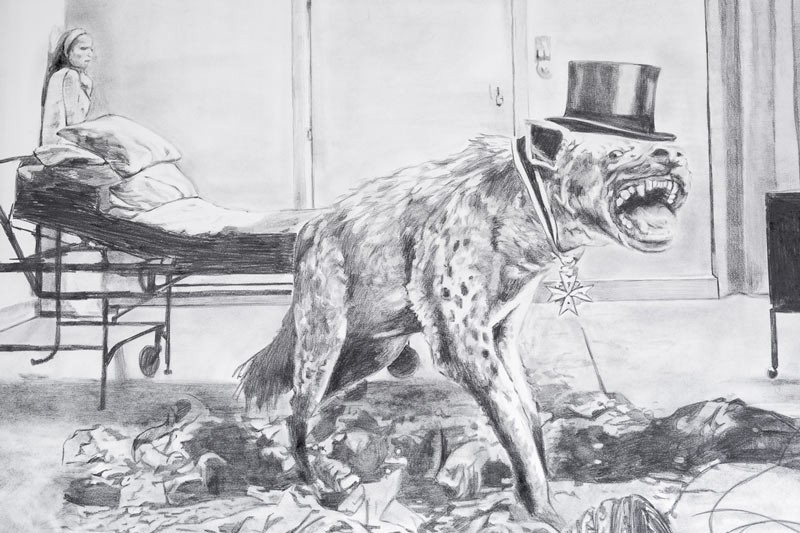 CP: Por um lado, gosto que as imagens, depois de desenhadas, me surpreendam com uma leitura qualquer, algo inconsciente. E por outro, às vezes, é intencional justapor determinadas imagens. Mas a justaposição nunca pode ser total porque não tenho nem na minha cabeça, nem no meu arquivo, a totalidade das imagens produzidas; há sempre imagens em falta. E quando aparece a certa, aí penso que esta imagem fica bem com aquela. Por vezes, a escolha é deliberada, noutras situações, é espontânea. Passo tempo a navegar nos livros ou na internet, mas não escondo o zapping na televisão. Tenho um desenho que é inspirado em John Heartfield, que é uma enorme referência para mim. É arte política do tempo do III Reich e do melhor que se criou. Temos a hiena de Heartfield e, por trás, surge uma cena do filme Persona, de Ingmar Bergman. A mensagem deste desenho é intencional, enquanto na de outras é quase inconsciente. Mas em conversa com o meu filho, de 9 anos, ele referiu que aquilo que mais o inquieta nesta obra não é a hiena enraivecida, mas sim o que a personagem do desenho estará a ver na televisão para não olhar para a hiena feroz. É mais assustador o que alguém vê na pequeno ecrã do que ter uma hiena no quarto, ainda para mais num ambiente hospitalar. A leitura do Manuel resolveu-me a ideia, era aquilo que pretendi obter com esta representação. Deixo a leitura em aberto ao observador.