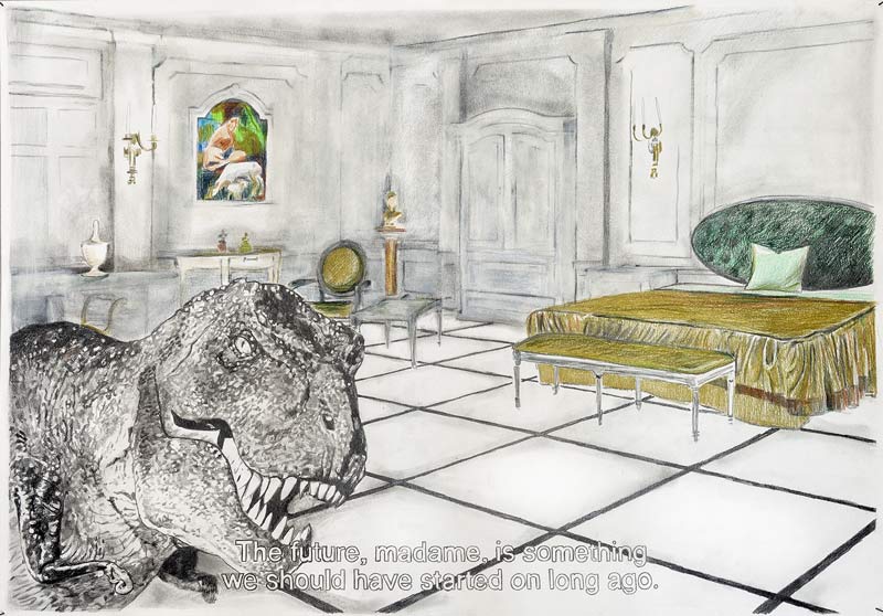 CP: No sentido da técnica, é pelo processo da paragem. Como linguagem, é pelo processo de escolha. Os nossos antepassados do Paleolítico também eram colecionadores. Não estou a louvar uma época de ouro da arte sobre outras, mas, de facto, o Paleolítico foi uma época de ouro na arte. No Neolítico, suspende-se a pintura; começa arquitetura e a era do trabalho. E é também pela possibilidade de selecionar imagens do arquivo geral, suspendê-las para retornarem à circulação, que desenho o que desenho. Geralmente, escolho-as do cinema, mas não só. Por um lado, essa vontade de combinar imagens, por outro, a vontade de travar alguma coisa, quando estou diante de um papel branco com um lápis na mão.