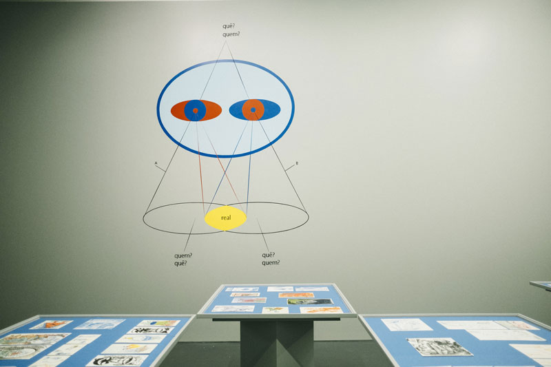 MD: Poder-se-ia dizer que duplo vê é um espaço narrativo que está sempre atualizado, como um livro ao qual teríamos de acrescentar sempre páginas ou personagens. Não é primeira vez que utilizo este dispositivo que torna evidente a relação do desenho com a escrita. Olhamos tanto como lemos. A disposição dos desenhos na mesa permite ainda relacioná-los de maneira menos hierárquica, multiplicando as trajetórias e as interpretações possíveis.