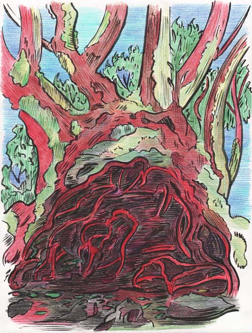 LV: Em alguns dos desenhos, a natureza é bastante visceral. Há árvores que têm algo de intestino. Parece-te que a natureza nos teus desenhos é mais do que o espaço do acontecimento, sendo muitas vezes o acontecimento em si?