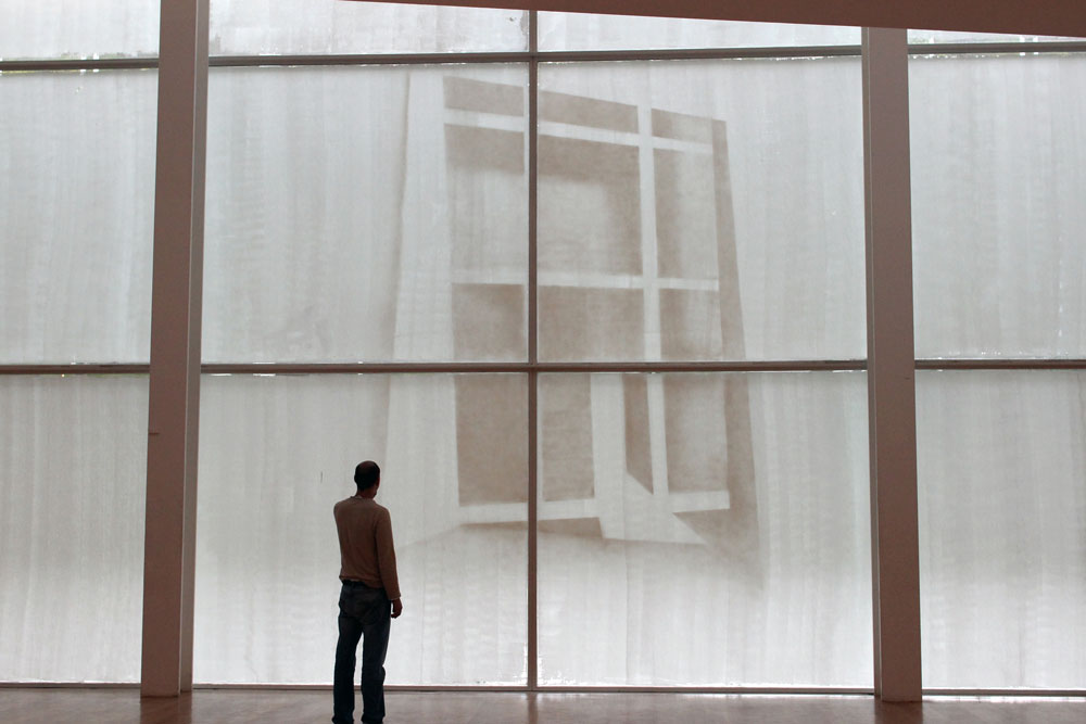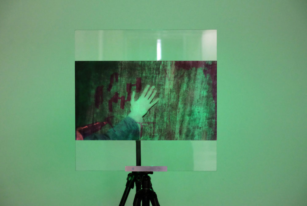 Projeção vídeo, cor/som loop, sobre vidro acrílico com impressão fotográfica UV, tripés.