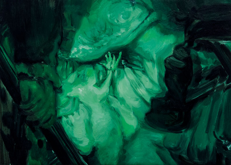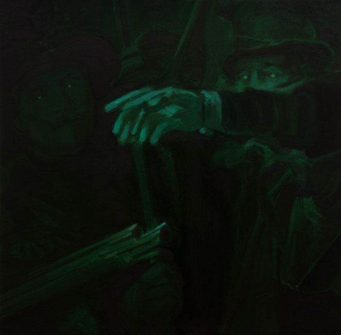 Movimentos diferentes acontecem em simultâneo, e tudo com uma composição que é também bastante teatral (podiam estar num palco). O tratamento da luz e das sombras revela detalhes semânticos. Ir a cada uma dessas ações permitia-me fazer uma longa série de quadros como planos de um filme noir. Na manipulação de cada detalhe escolhido servi-me da ideia de night shot que apresenta, perante o nosso olhar, uma imagem em tons verdes. Essa imagem resulta de um instrumento óptico capaz de ler frequências eletromagnéticas que o olhar humano não consegue identificar. Lembrei-me da série fotográfica do Thomas Ruff e das imagens de guerra que se tornaram icónicas a partir da Guerra no Golfo.