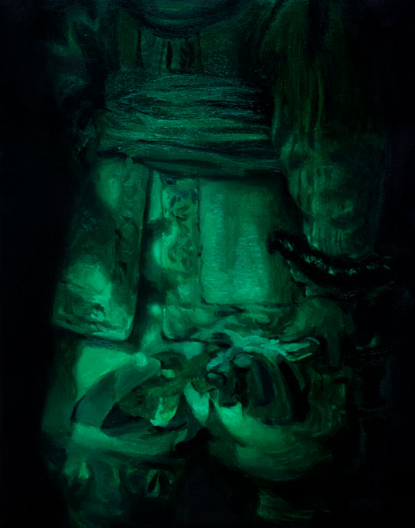 SC: No livro A Ronda da Noite, com o mesmo título da tua série, Agustina Bessa-Luís, vai descortinando a história das personagens em torno desta obra / cópia de Rembrandt, que tem uma simbologia específica para cada uma delas. A deslocação da pintura de casa em casa, provoca um corte necessário na mesma para poder caber num espaço específico, mais tarde existe a ampliação de uma sala para a receber. São circunstâncias que também vão revelando o declínio daquela família. Ao longo do texto recorta-se a obra, na busca de uma tradução e explicação de cada personagem, gesto, animal ou objectos representados; a personagem Martinho ensimesmada com a pintura tenta encontrar o seu próprio sentido vital. Do mesmo modo, tu retalhas, amplificas detalhes, dando um outro significado a esses pormenores, dás a ver uma outra obra.