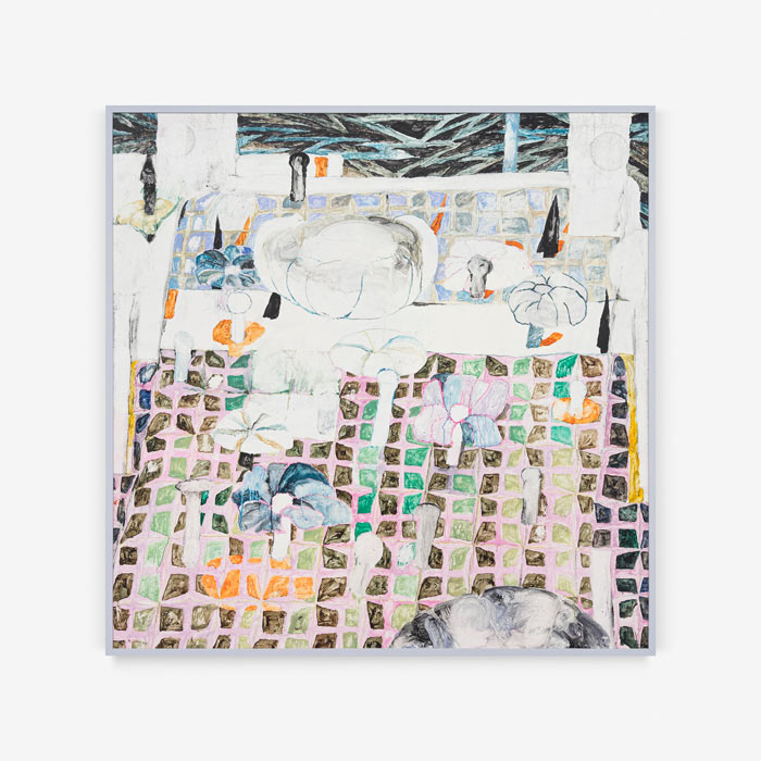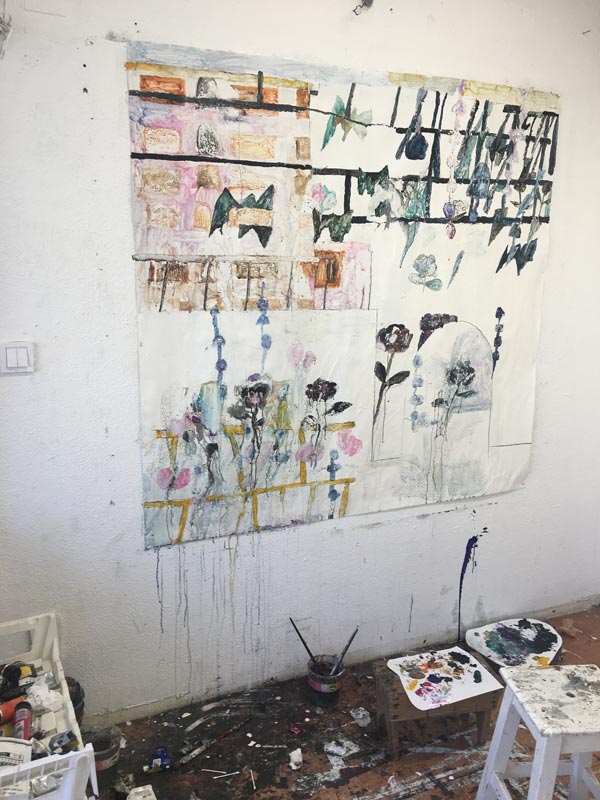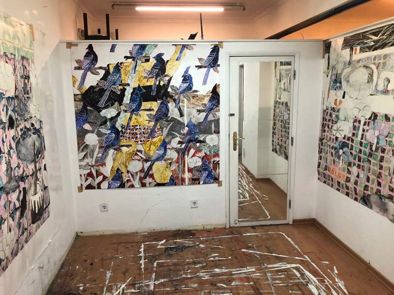 Normalmente, e mesmo nas casas, há sempre alguma coisa que despoleta a imagem, que despoleta a vontade de pintar qualquer coisa. Quando não há nada que despolete essa vontade, faço um padrão de início e ultrapasso o obstáculo inicial de começar a pintura. Numa outra pintura foram os pássaros, e eles trouxeram outras coisas. É uma maneira de desprender o início do processo. Porque queres pintar, mas não sabes bem como e queres à mesma fazer qualquer coisa.
