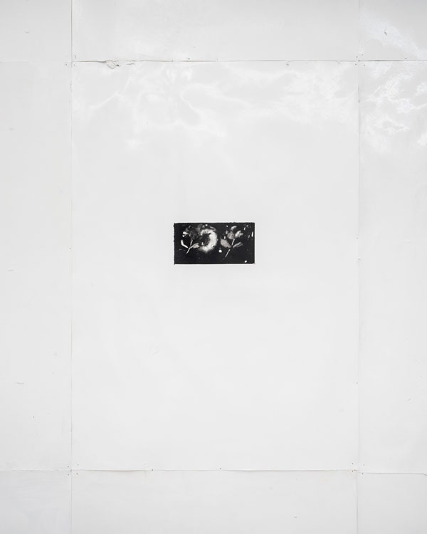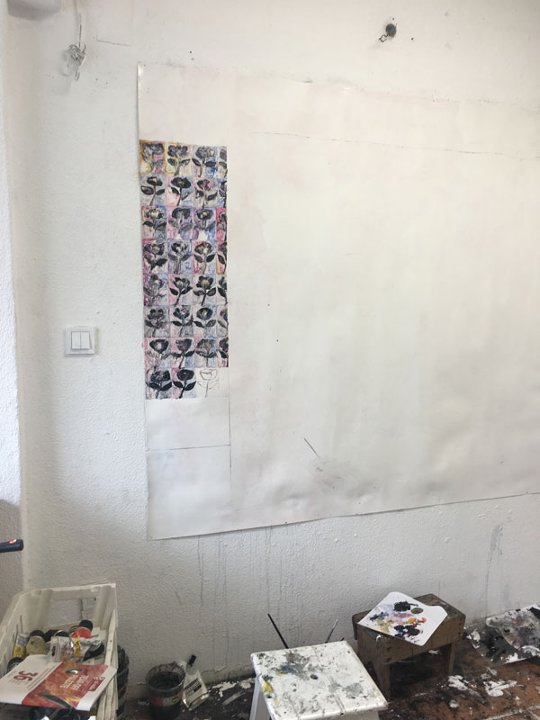 Foi um gesto que repeti tantas vezes que me sai naturalmente: uma flor. Tive a ideia de usar uma das paredes da galeria e fazer os desenhos como repetições, tendo como referência os posters afixados nas ruas, colocados em fila. A mesma imagem a tentar ocupar o máximo de espaço possível, numa economia de composição. Não interessa a composição, tens a parede x e tens de tentar pôr o máximo de cartazes para se sobreporem aos outros que já lá estão e a tua informação chegar a quem vê.