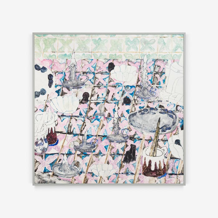 Numa destas pinturas recentes utilizei as velas como motivo. Estava a ver umas imagens do Pinóquio e há uma personagem que é uma vela constantemente acesa. Ou seja, uma figura antropomórfica, cujo topo da cabeça é uma pequena chama. Como é que pode existir esta personagem? Está literalmente a desaparecer. Não cheguei a rever o filme, não sei se é uma personagem que é só simpática ou se tem algum stress, mas o poder dessa figura ficou comigo. Então comecei a colocar várias destas figuras, da vela em chamas, a preencher a imagem. Depois comecei a imaginar onde poderiam estar estas velas e daí veio a imagem da mesa e para terminar a pintura preenchi com outros motivos que pudessem estar nessa mesa. A imagem final apareceu passo a passo. No final a toalha de mesa acaba por ser um motivo em si, e o motivo que salta mais à vista.