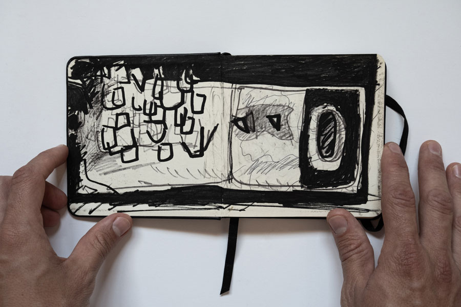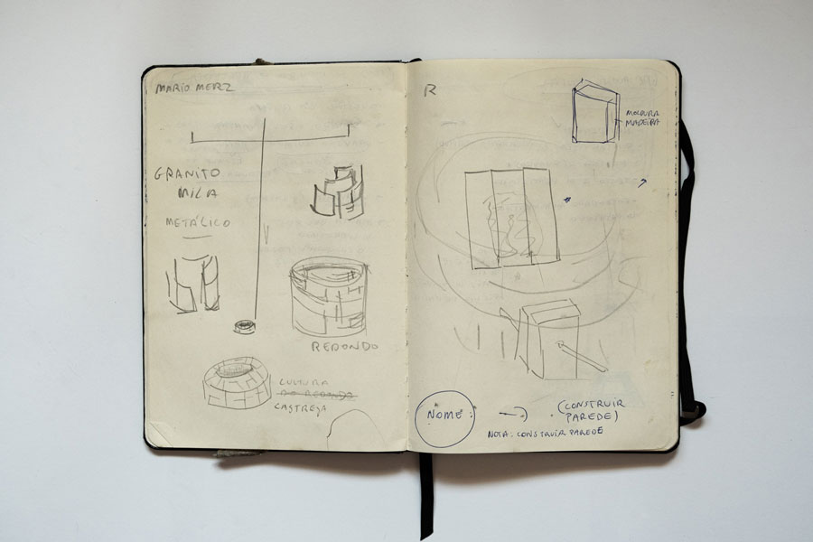 João Gomes Gago: Este diário, delimitava a substância das minhas escolhas… O exercício do registo em formato de diário, passou por uma procura democrática mais objetiva da forma, pela sua função, página após página, na medida exata. São registos rápidos, caligrafias cheias de tinta, linhas simples ou mais complexas, de cadências gestuais e interdependentes… Interessava-me um discurso direto que espelhasse sensações visuais simples, ou elementos de prova de uma linha temporal. Quando senti aquelas arquiteturas circulares da pré-história no norte de Portugal fiquei mesmo preso à imaginação.