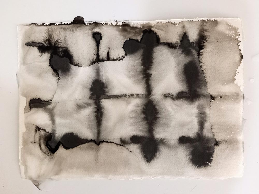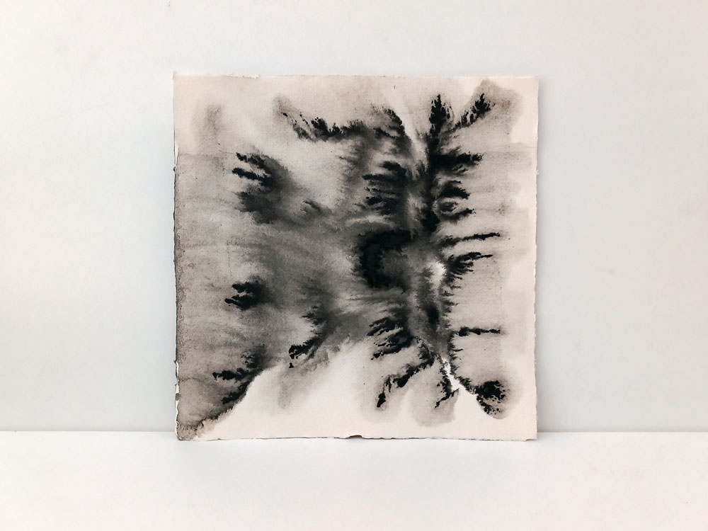 A exposição consiste basicamente no confronto de duas pinturas de grande formato, 5 m x 2,5 m, da série que realizei em Arantzazu e que ocupam uma parede inteira, uma negra como se estivesse queimada e outra transparente mas que é o vestígio da primeira, com uma série de 100 desenhos a tinta sobre papel japonês feito à mão, realizados no meu novo atelier em Lisboa e expostos como um diário de bordo, com fragmentos de poemas de Sophia de Mello, Rui Nunes ou Herberto Helder, que fui lendo à medida que ia realizando este trabalho. Interessa-me contrastar a densidade material e o peso das pinturas de grande formato com a leveza do papel e dos desenhos que são quase traços de tinta, traços que surgem à medida que o papel seca e que transmitem a memória das formas deixadas pelas marés nas salinas ou nas margens da Ria Formosa.