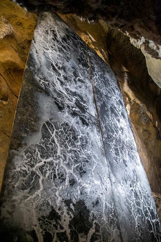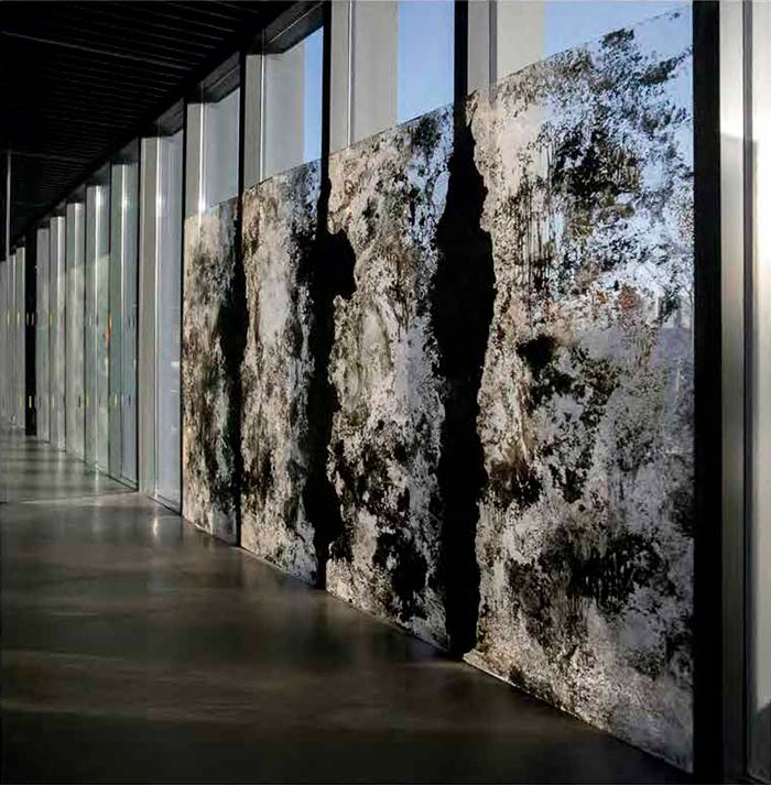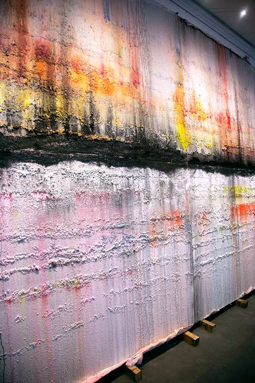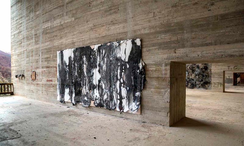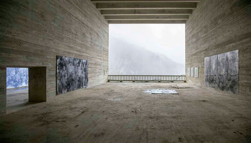 LV: Em “Rituales del imaginario” (2016) vemos então como as montanhas envolventes ou essa grande janela-quadro do edifício se transfiguram nas tuas obras a uma escala diferente, mas com o mesmo “peso”, se quisermos seguir a citação que fazes de Bachelard, de que “não se trata tanto de descrever formas, mas de pesar uma matéria”. A questão da “escala” é um processo muito consciente na tua obra? Mencionas o facto do longe e do perto se confundirem quando a matéria se expõe.