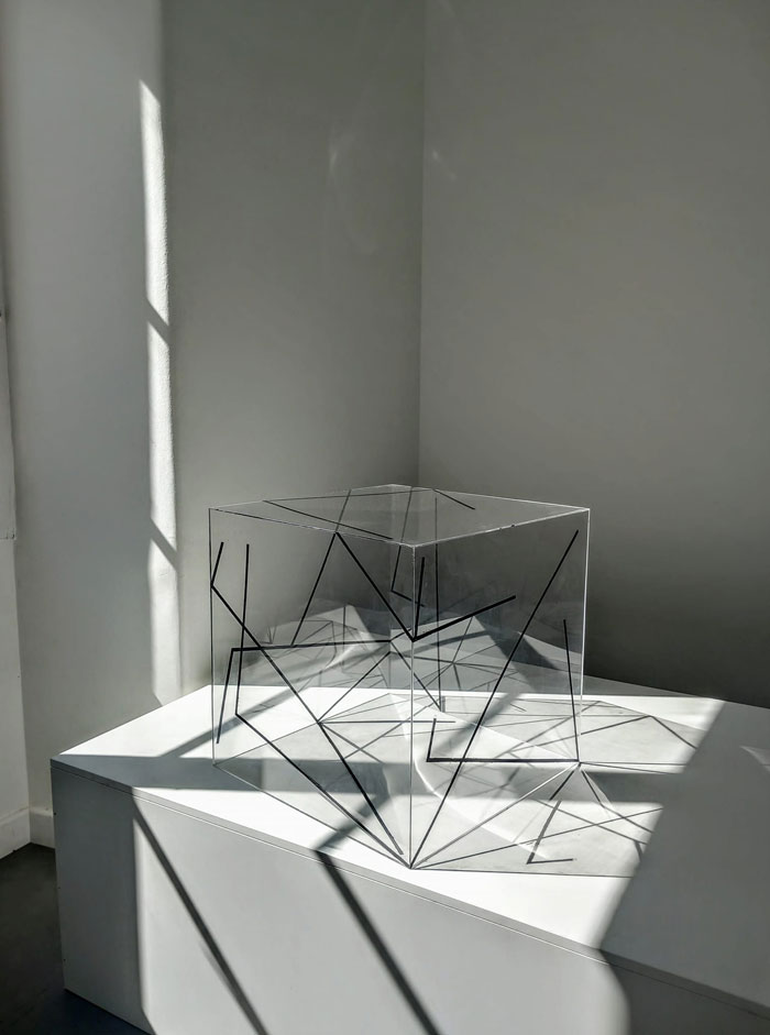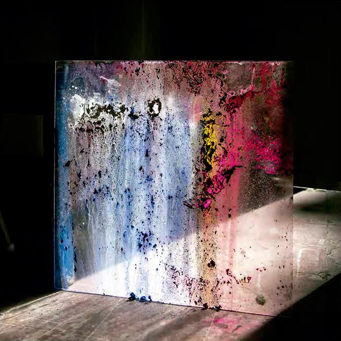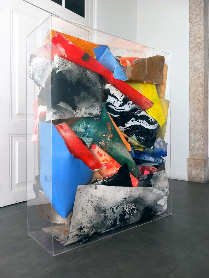 Esta exposição no Museu de História Natural foi como uma síntese de todos estes anos. Sempre trabalhei de forma seriada, mas aqui cada peça tinha uma entidade diferente e um percurso diferente, o que produziu um diálogo interessante entre elas. Era como se estivéssemos a falar da mesma coisa mas com vozes diferentes. Essa fragmentação reforçou uma imagem de vestígios arqueológicos. Havia peças de grande formato, uma Homenagem a Vieira da Silva intimamente relacionada com a instalação de 2019, ou outra que foi feita no ano passado para uma instalação numa gruta pré-histórica perto de Castellón, na costa mediterrânica. E havia ainda caixas de acrílico que funcionavam como sedimentos de memória, ou como resquício de matéria atravessada pela luz.