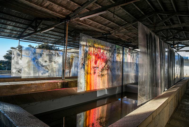 LV: A ideia de “escala” estava também muito presente na tua instalação intitulada “Quatro paredes de água” (2019), que realizaste para o Lavadouro das Francesinhas, no bairro da Madragoa, em Lisboa. Eram oito peças de grandes dimensões, em acrílico transparente pintado, penduradas verticalmente sobre a água dos tanques. O efeito era deslumbrante, a luz incidia nas placas e o reflexo da água prolongava a pintura. Era como se a água se fizesse pintura. Afirmaste que essa instalação era “una investigación sobre la creación de pintura habitada. Las superficies de color desaparecen, se vuelven aire, y al pasar la luz a través de ellas y producirse todo tipo de reflejos en el agua y entre ellas, el espacio se convierte en pintura”. Este interesse em expandir a pintura para lá de um suporte, mas ao mesmo tempo garantindo a sua materialidade, ou em colapsar o interior e o exterior, são preocupações constantes para ti?