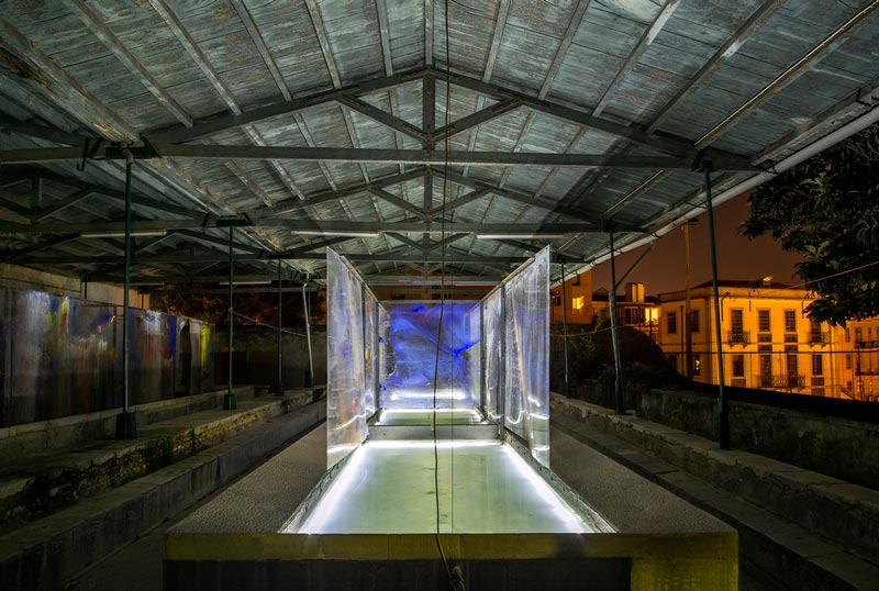 Esta instalação foi possível graças ao trabalho de produção de Leonor Pereira. Teria sido impossível para mim fazer todo o trabalho a partir de Espanha. A ideia veio do sítio. Este lavadouro do século XIX, com a sua vista panorâmica sobre Lisboa, era o sítio ideal para formalizar as novas ideias. Esta instalação foi a última imagem pública do sítio, uma vez que desapareceu. Vão construir um centro social no seu lugar. Cada tanque de água tinha peças de acrílico de 12 m x 2 m a voar por cima, a poucos centímetros da fronteira entre a pedra e a água e reflectidas nela. Funcionava como uma caixa de ressonância. A luz passava através das quatro peles e os tanques eram como barcos, tinham esse simbolismo e, ao mesmo tempo, é muito óbvio, tinham também uma relação com o trabalho das lavadeiras, com a lavandaria. É de facto uma homenagem a tudo o que estas paredes ouviram. Na altura, era um espaço da cidade cheio de vida. Criava um efeito óptico de uma urna, de entrar numa clareira na floresta. Num interior, surgia a imagem óptica de entrar num exterior. Criou uma espécie de templo, dentro da imagem de templo que o lavadouro já tinha. E foi interessante como os ruídos e as imagens da cidade também se reflectiram nas peças de metacrilato. O objectivo era que a pintura fosse um espaço. Como diz Merleau-Ponty: "Já não se trata de falar do espaço e da luz, mas de fazer falar ao espaço e à luz que aí estão".